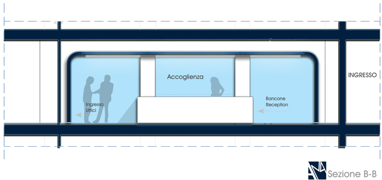 Analisi degli spazi, Analisi dell'immobile, Studio di fattibilità, Interior Design, Rendering, per l’allestimento dell' area Reception/Accoglienza della sede in Milano.